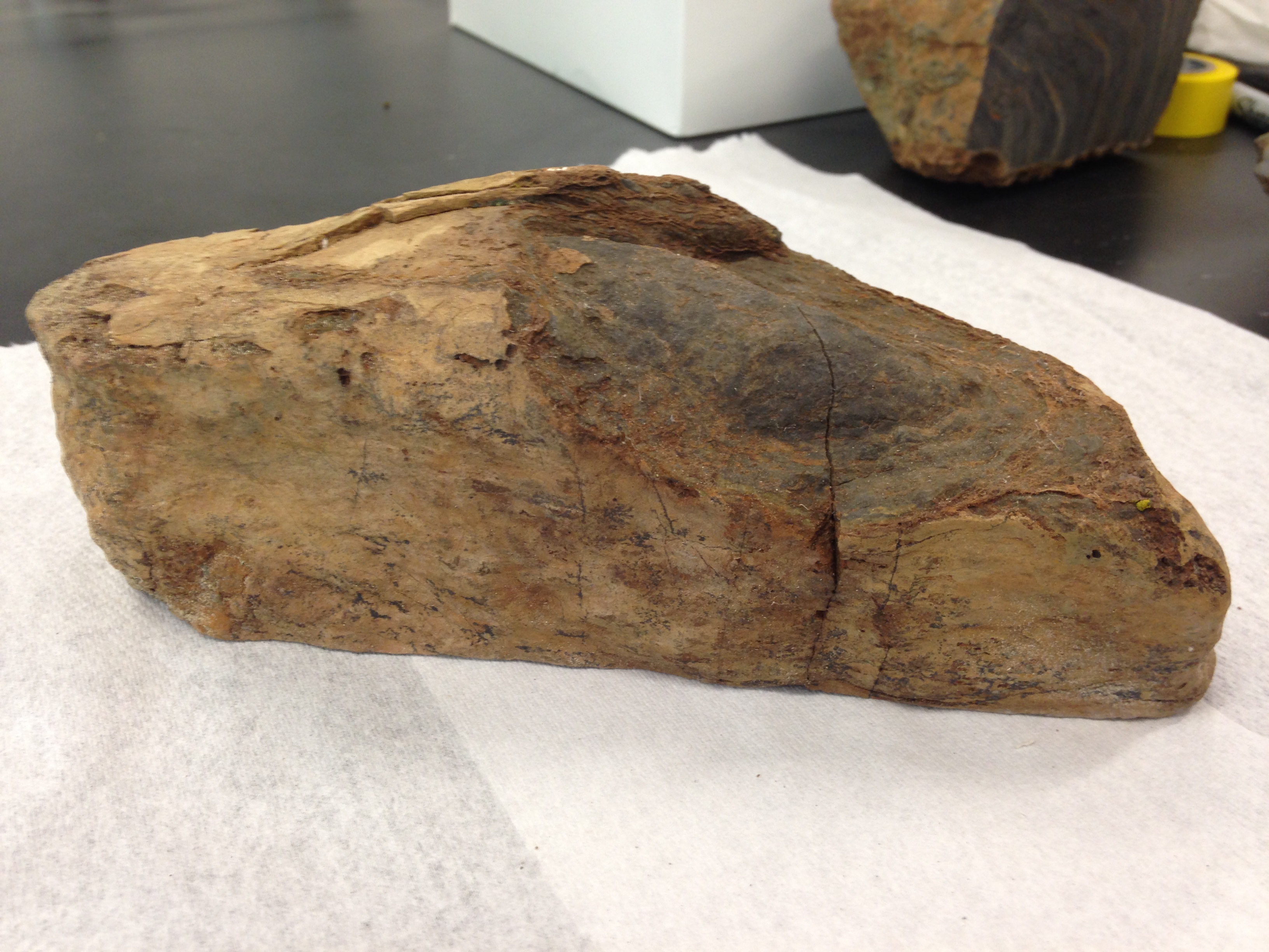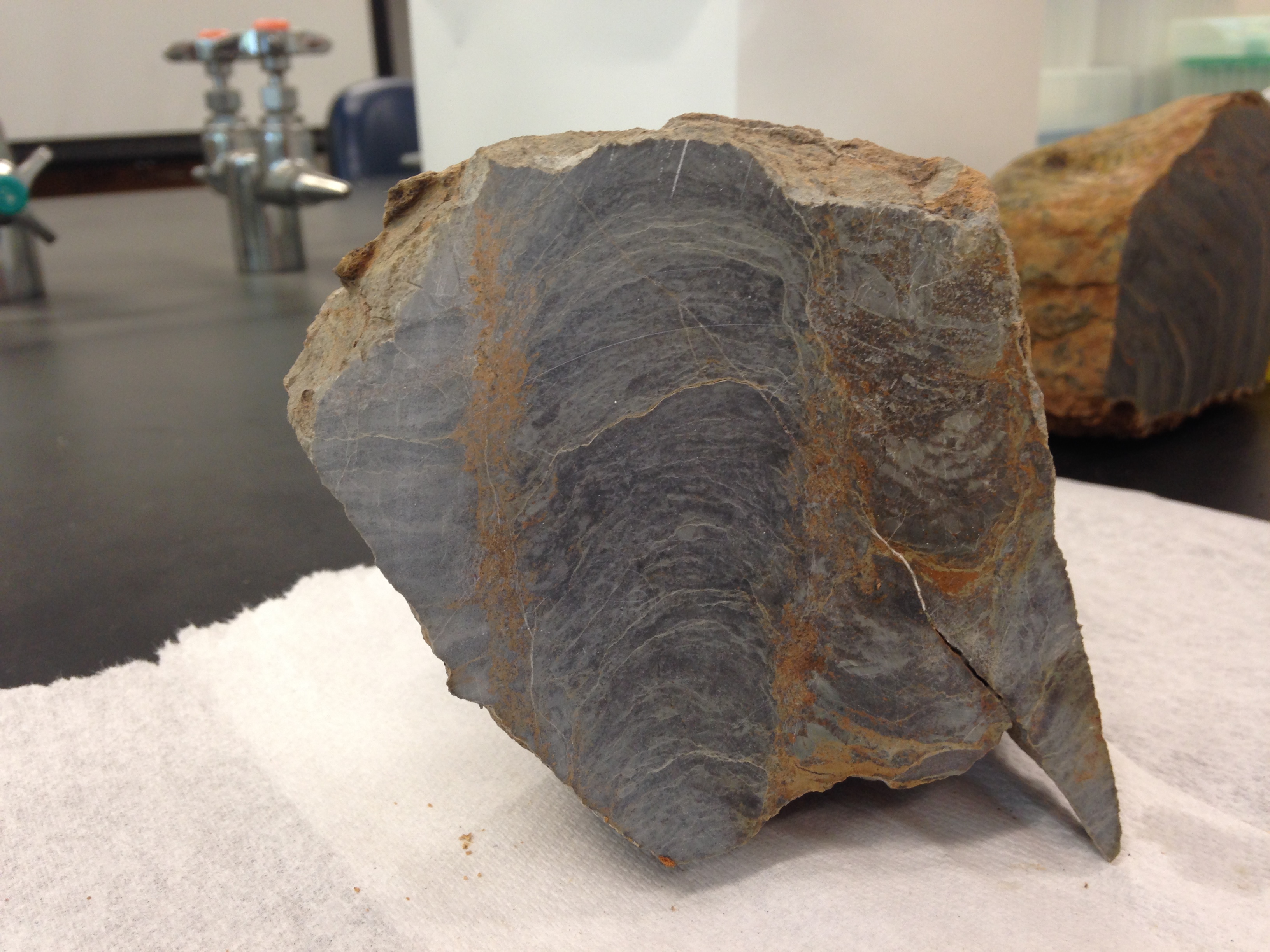 I went back up to the rock saw lab to help Victoria Petryshyn cut some of the larger stromatolites from Walker Lake. These are carbonates that are somewhere around 30,000 years old.  ImageThere are growth patterns up and then off to the side, just very cool.