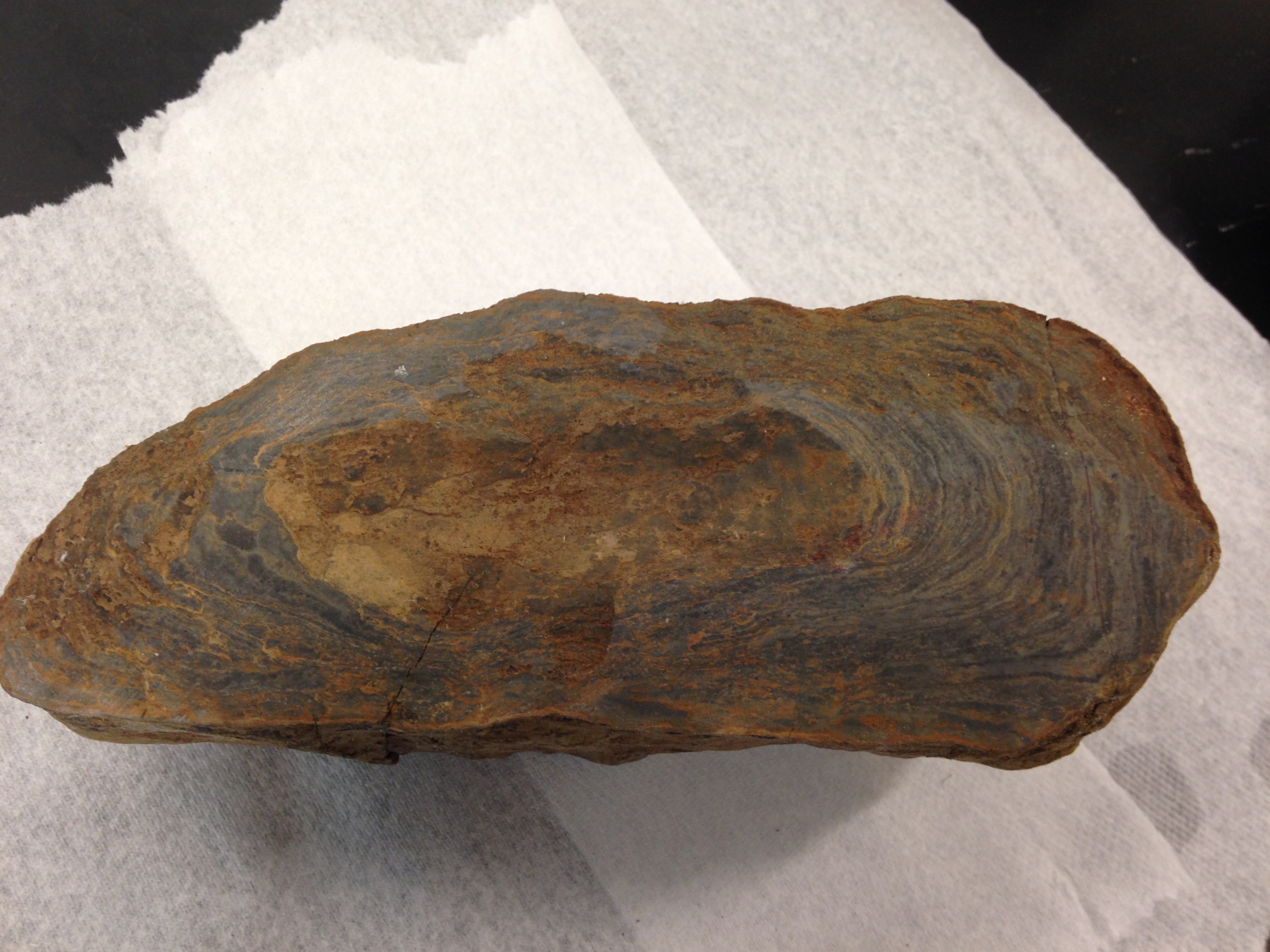 In the afternoon, I was also able to use the rock saws and rock polishers to cut and polish some of the stromatolites that I collected at Mt. Dunfee. Here is one of my favorites below. This is the top of a stromatolite that is 542 million years old. The layers of the ancient microbial mat are preserved in this rock. You can see the top of the stromatolite in the picture below.