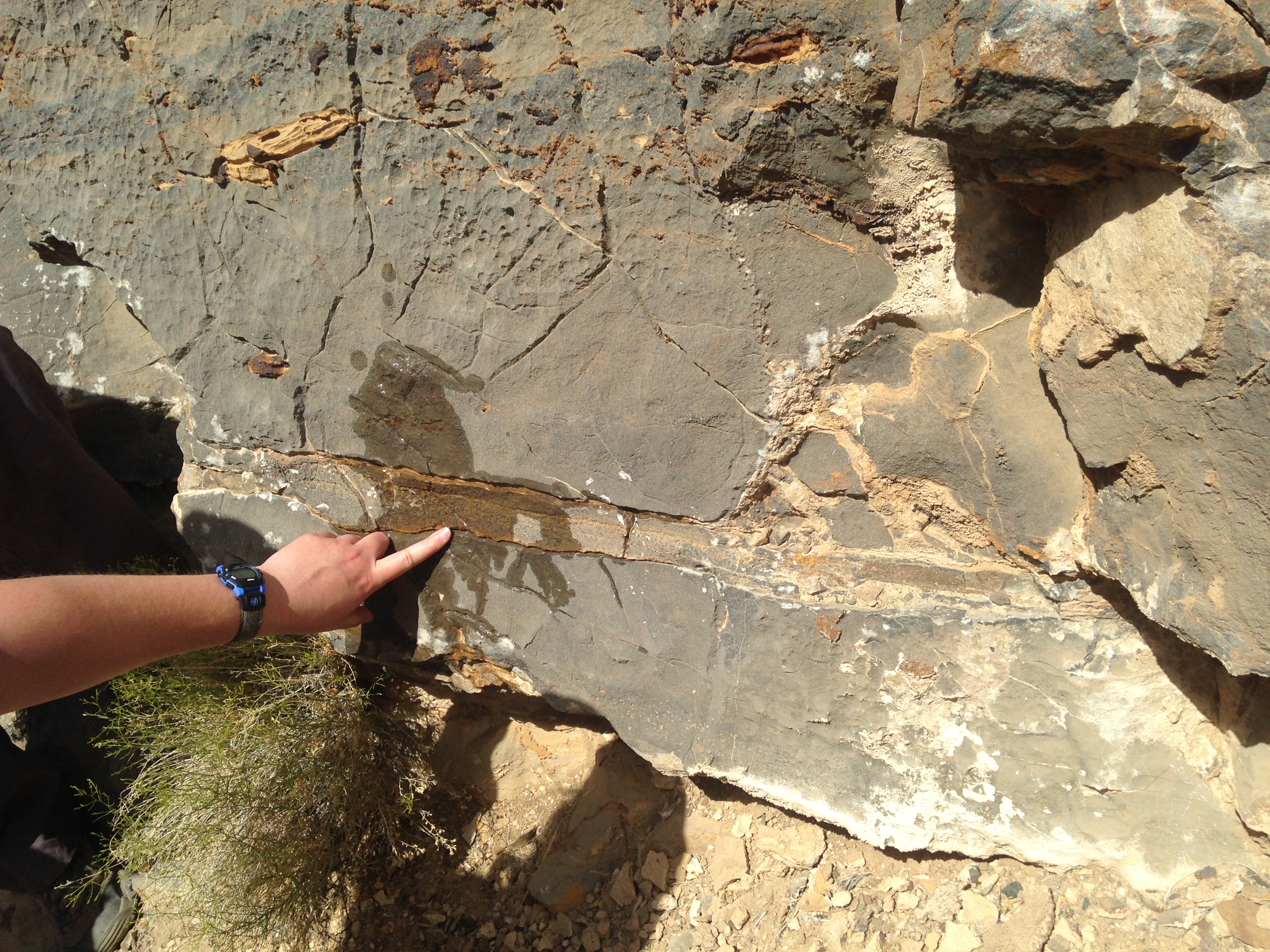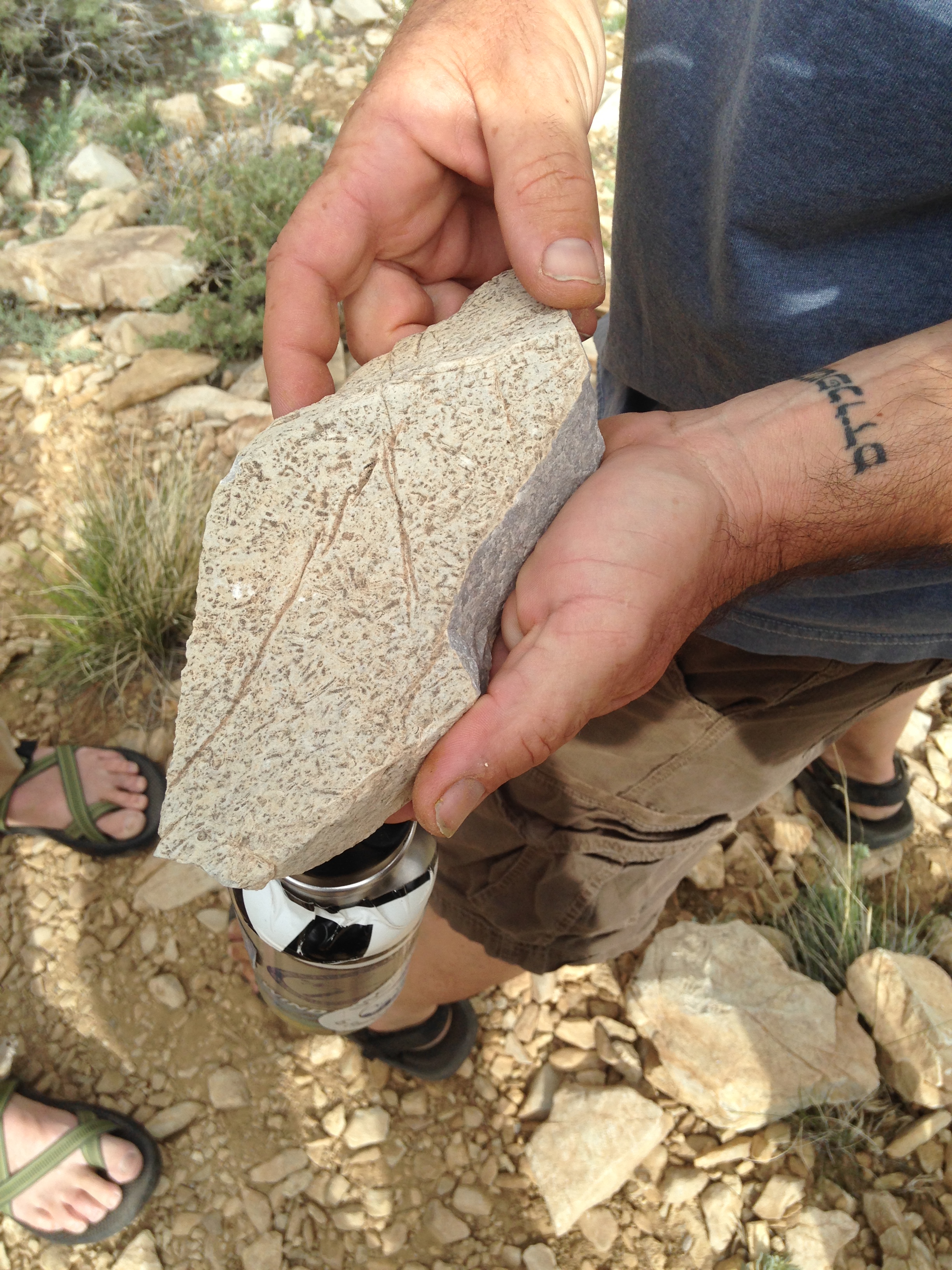 I also got my first experience of hunting ancient fossils (these were around 500~550 million years old). These were called Cloudina, formed by the Cloudinids (http://en.wikipedia.org/wiki/Cloudinid). These were small (2-5 mm) cone shaped shells of an ancient worm-like animal. We were looking at the fossil record of a shallow, relatively calm ancient sea…totally cool. I eventually found my own specimen which had both the cone shaped pieces and a longitudinal tube-like fossil, so cool. Amazingly, I forgot to take a picture of my rock so here is one that Russell Shapiro found and was using to help guide me as to what I should look for (I am not such a great fossil hunter yet).