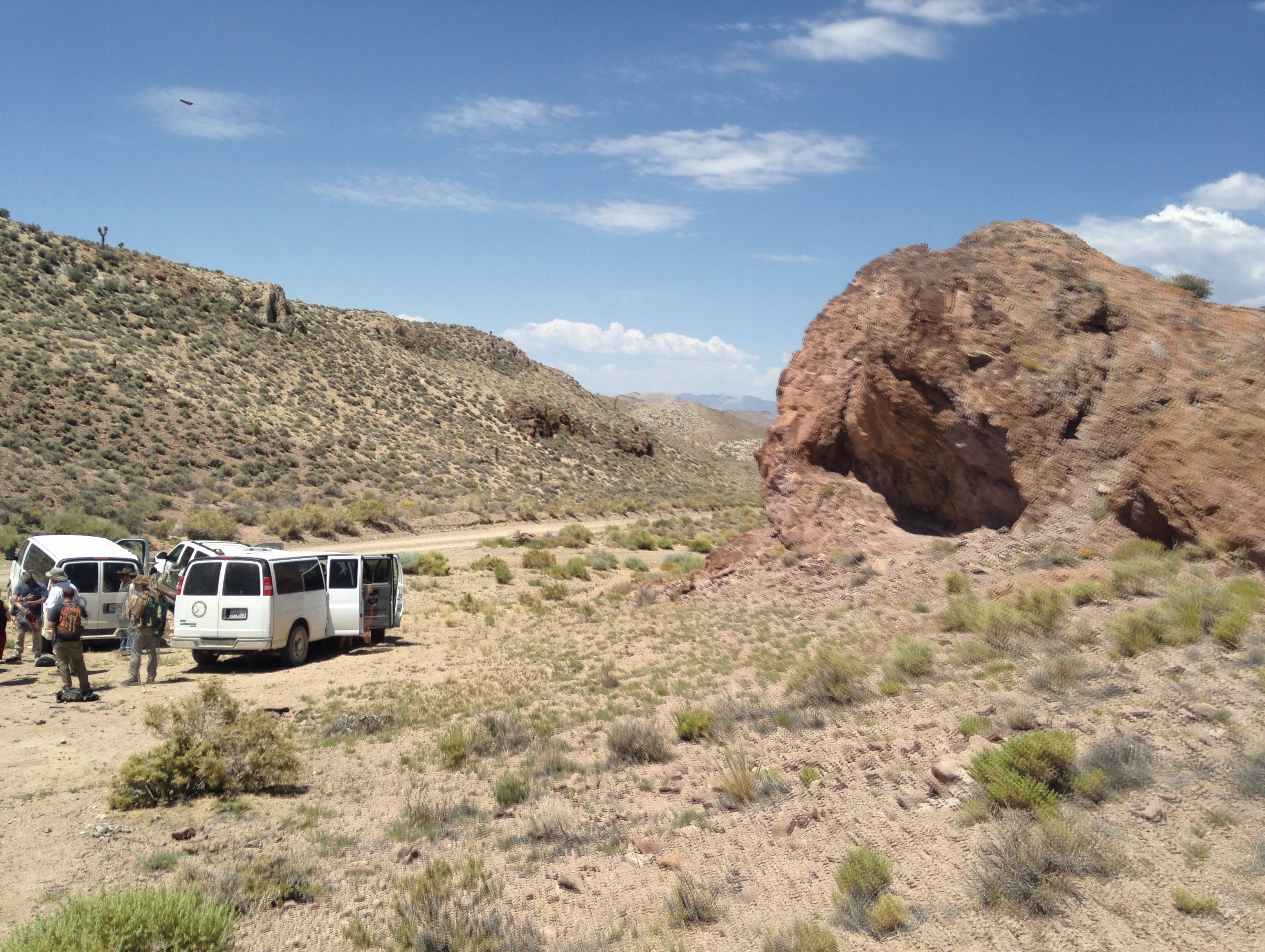 After driving through the touristy ghost town Goldpoint, NV, we arrived at the foot of Mt. Dunfee, NV. Here we are assembling at the foot of Dunfee, with a 45 min hike to the stromatolites.