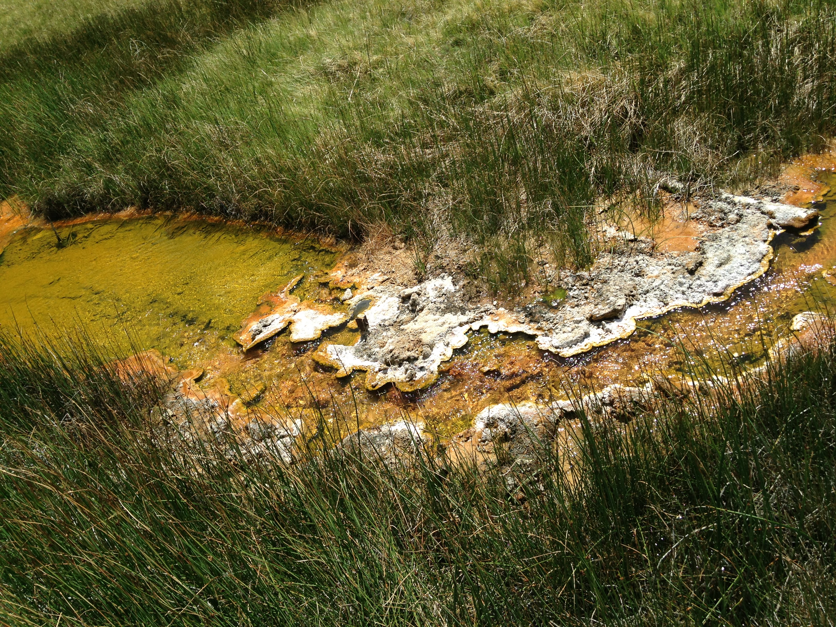 Today we scouted out the site of our major field sampling event tomorrow. It is called Little Hot Creek. It is a series of hot springs that feed into the Little Hot Creek, which is part of the Owens River region. These are gorgeous springs that are relatively pristine. Microbial mats and carbonate precipitation are all occurring in the same general area so there is a lot for the Geobiologist to study. Our main interest is in determining how the microbial communities change along the creek with changing temperature and water chemistry. We are also interested in how the interaction between microorganisms and the minerals cause stromatolite-like structures in the water (see below).